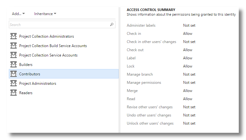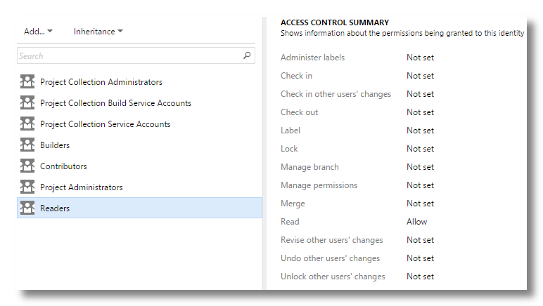 I came across an interesting bug this morning in Team Foundation Server 2013 Update1 were a team member was in the Readers, Contributors, and Project Administrators groups for a project. You would expect him to have a union of the permissions granted by those roles as long as none of the roles explicitly denied a permission. That is the behavior described in the MSDN documentation. That was not the case because he couldn’t checkout a file or doing anything else beyond reader level access. Once we realized he was in all three groups and guessed that might be the issue we removed him from the readers and contributors groups and he was then able to checkout files. I have included two images below of the Reader and Contributors version control permissions as proof that none of the permissions were explicitly denied.